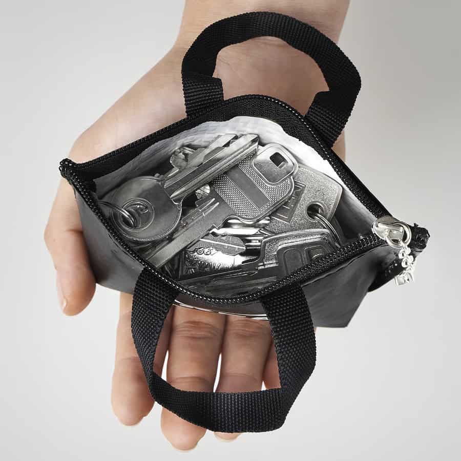 Tired of looking for keys, coins and other small things in your backpack? Then you’ll probably like this small bag with a keychain and a zipper that keeps the contents from falling out.